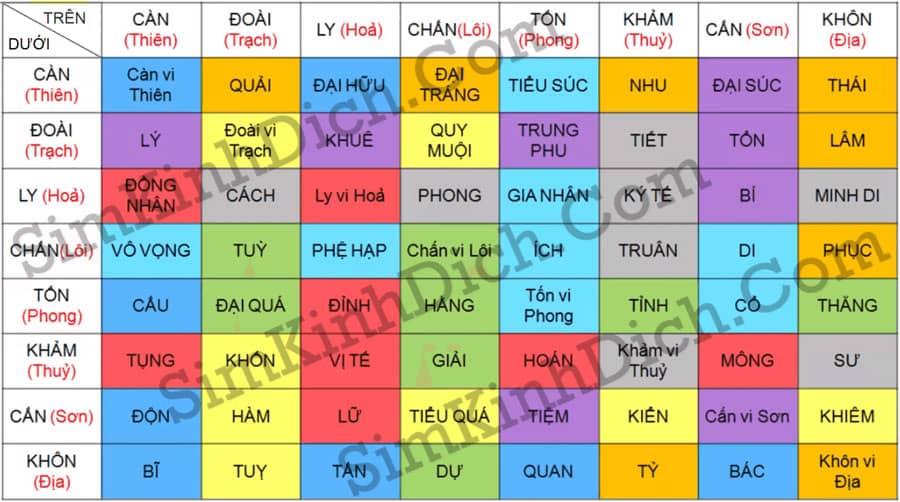 Thượng quái là Hỏa, hạ quái là Địa, chúng ta tra cứu theo bảng dưới đây thì chúng ta biết được số điện thoại này có quẻ chủ là Hỏa Địa Tấn.